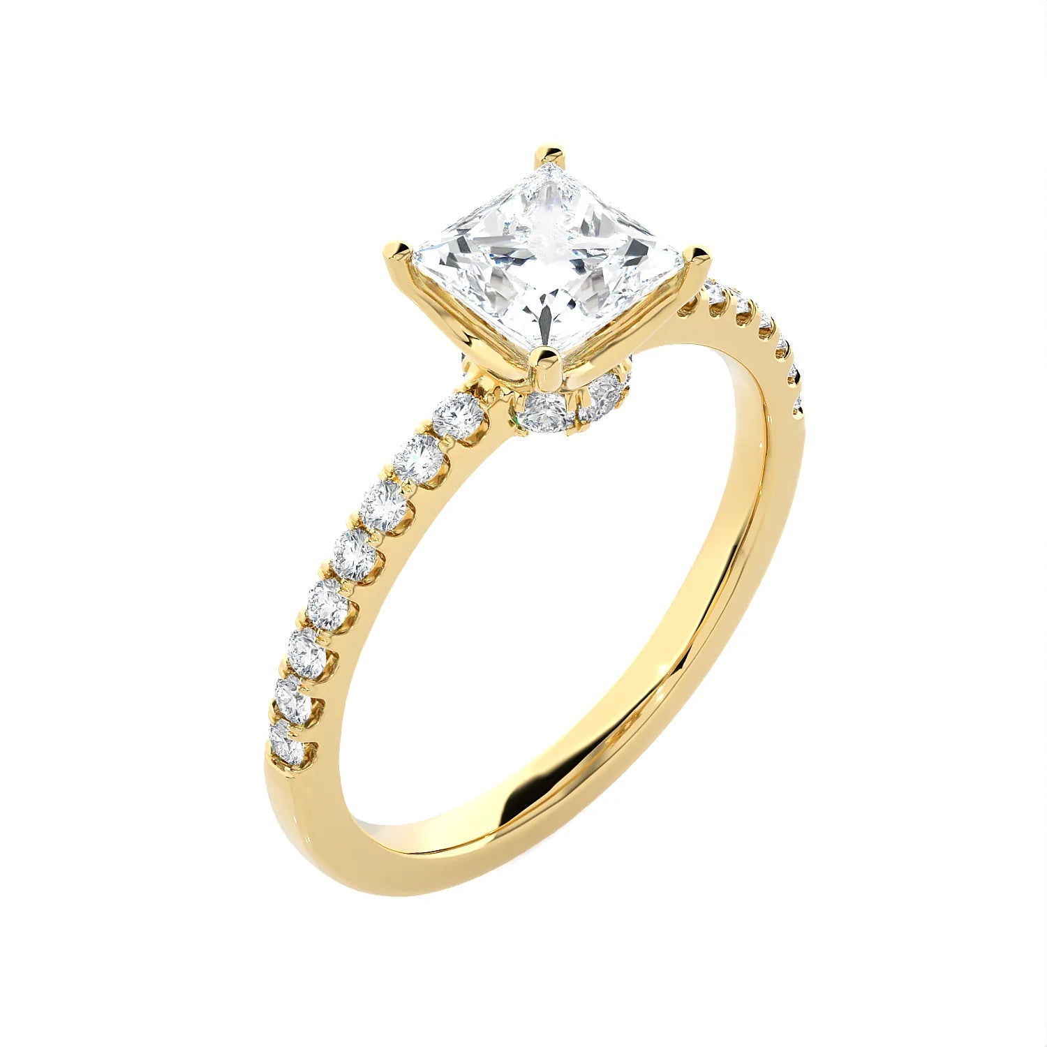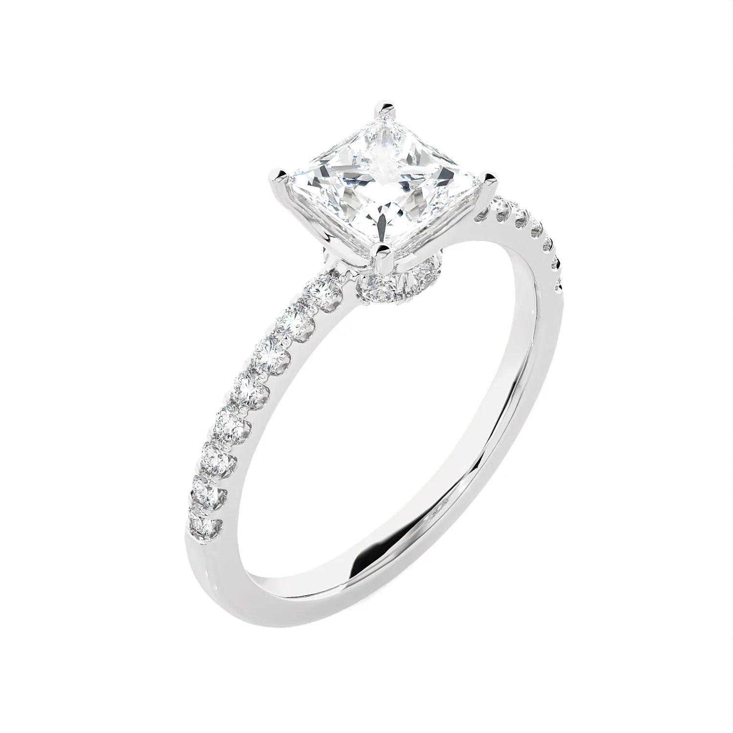 Elegant princess-solitärring med upphöjd infattning och gnistrande pavéband